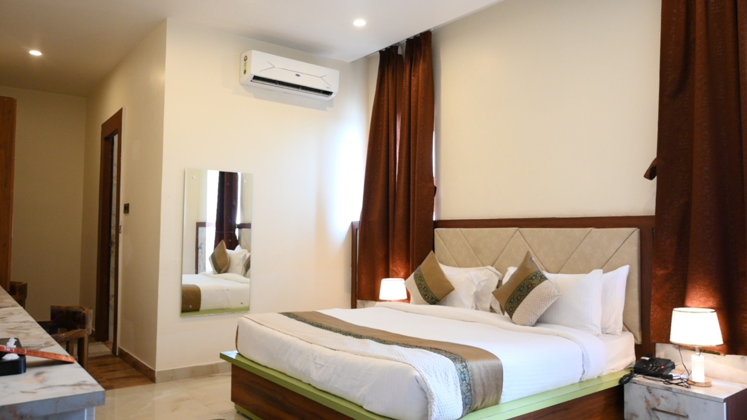 Spacious and bright guestrooms with elegant furnishings, wooden flooring, and large windows offering plenty of natural light.
